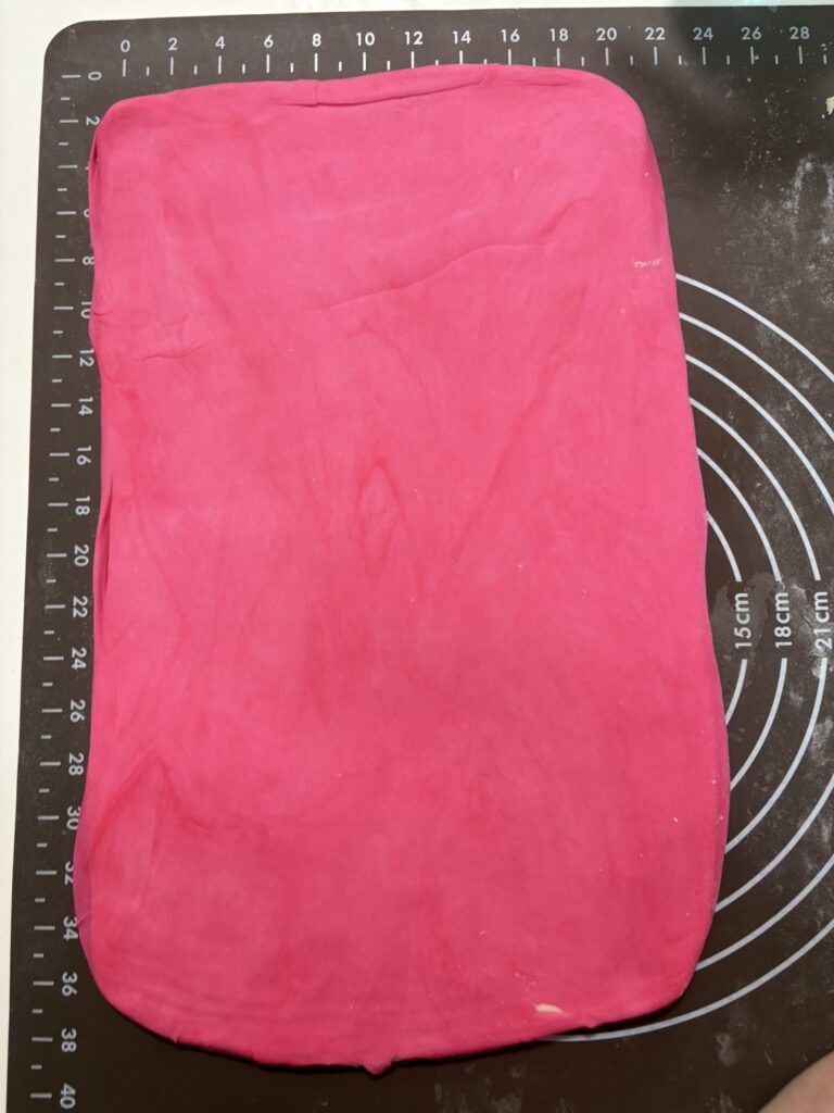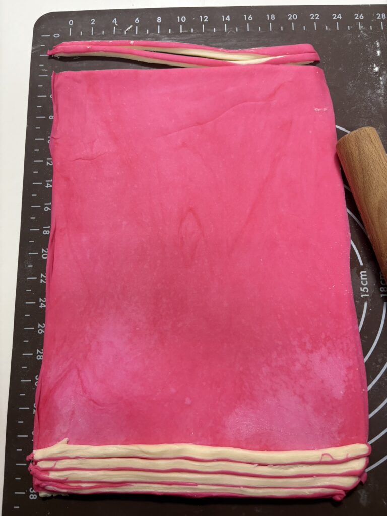 めん棒でやさしく伸ばして長方形にし、三つ折りを行う。ラップをして冷蔵庫で30分休ませる。