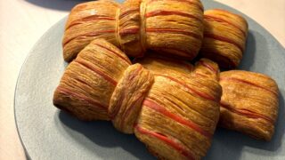 かわいいバイカラーリボンクロワッサンを作ってみました!材料強力粉 210g薄力粉 90g砂糖 25gドライイースト 3g塩 3gバター25gたまご 1個牛乳 180g折込用バター 150g食用着色赤 適量レシピ①強力粉、薄力粉、砂糖、塩、ド...